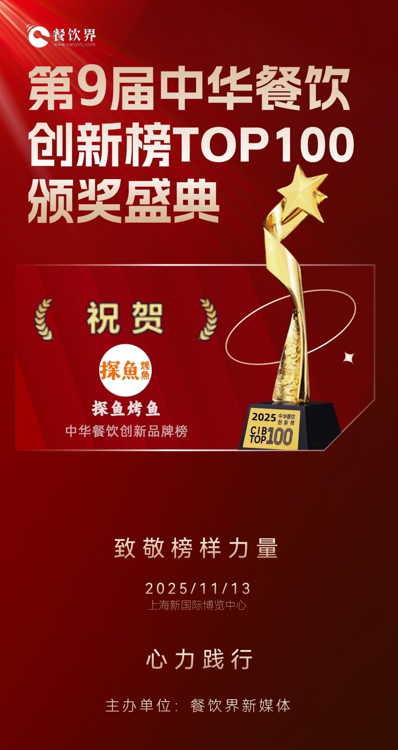 发表时间:2025-11-18 15:03 2025年11月13日,在上海新国际博览中心举办的“2025第22届中华餐饮双创论坛”上,“第9届中华餐饮创新榜TOP100”颁奖典礼盛大落幕。中国烤鱼行业现象级品牌探鱼凭借在产品工艺、场景体验及数字化运营领域的突破性创新,成功入选榜单,成为本年度餐饮行业创新实践的标杆代表。