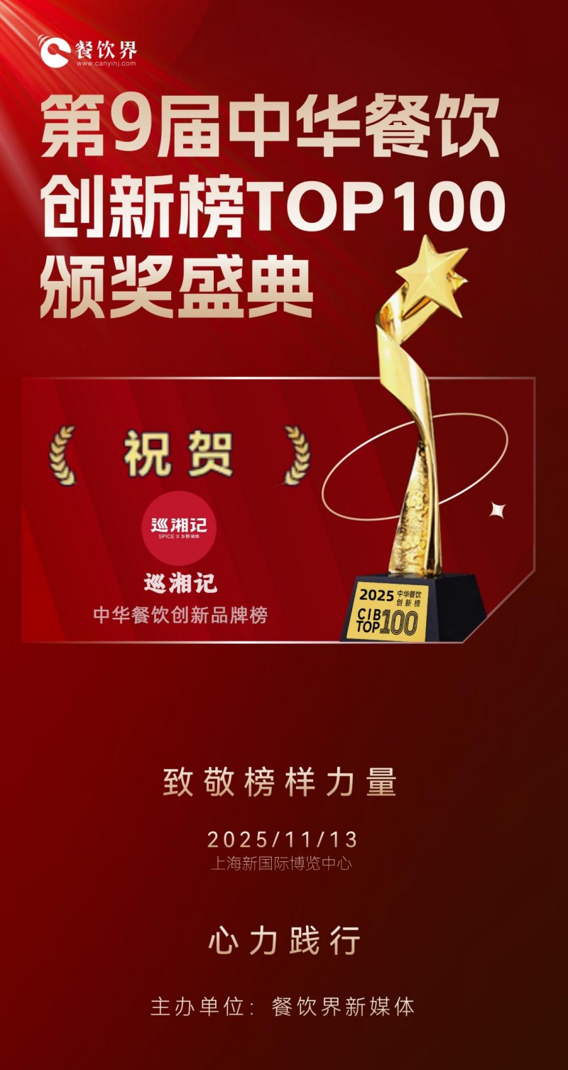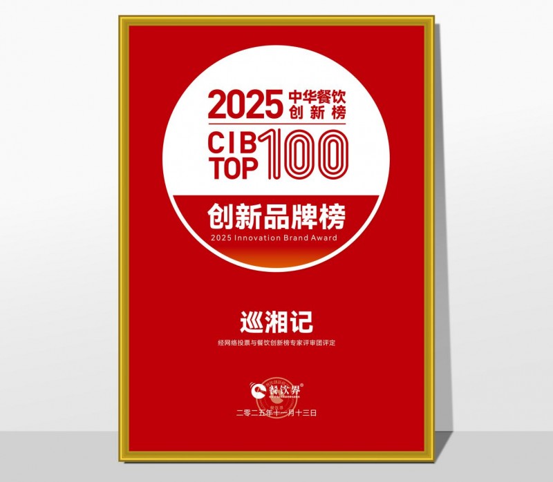 中华餐饮创新榜(CIBTOP100)作为国内首个以 “餐饮创新” 为核心的标杆性评选,由《餐饮界》新媒体联动全国150 + 媒体发起,自举办以来,已成功引领行业创新风向九年。本届评选更是盛况空前,通过300万 + 网友网络投票,依托全国150余家媒体联合推广,累计曝光量超千万级,其权威性与影响力不言而喻。在如此激烈的竞争环境下,巡湘记脱颖而出,彰显了品牌深厚的底蕴与强大的市场竞争力。