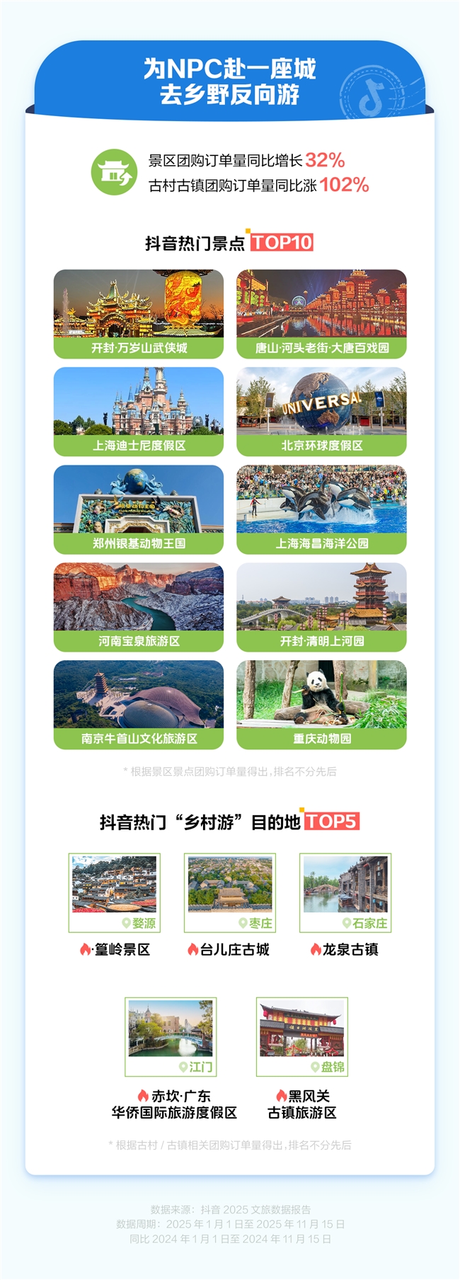 从订单消费看,上海、北京、成都、郑州、杭州等入围十大热门旅游城市。洛阳、湖州、秦皇岛、开封、徐州等入围十大热门宝藏城市。抖音景区团购订单量同比增长32%。“NPC游”、“IP游”持续出圈,万岁山武侠城、河头老街·大唐百戏园、上海迪士尼度假区、北京环球度假区、郑州银基动物王国、上海海昌海洋公园、河南宝泉旅游区、清明上河园、南京牛首山文化旅游区、重庆动物园成为十大热门景点。 “乡村游”火热,抖音古村古镇团购订单量同比增长102%。上饶婺源篁岭景区、枣庄台儿庄古城、石家庄龙泉古镇、江门赤坎·广东华侨国际旅游度假区、盘锦黑风关古镇旅游区成五大“乡村游”目的地。同时,非遗旅游愈发火热,抖音非遗酒旅相关团购订单量同比增长45%。非遗景区、美食、按摩、戏曲和展览展会是最受用户欢迎的非遗相关团购品类。长沙千灯会、2025沈阳之夜、司徒小镇、成都·千灯之夜等入围十大热门非遗景区景点。