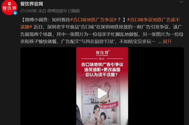 《餐饮界》微博小调查页面 其次,争论的另一焦点转向对批评本身的评判,即争议是否始于一场“过度解读”。另一家媒体《南方都市报》的线上调研则反映了类似倾向,大多数参与网友认为这是“过度解读,广告本意是体谅母亲,无需上纲上线”。持此观点的网友强调,广告仅仅是截取了一个现实生活片段进行艺术化表达,将其上升到“固化刻板印象”的层面是矫枉过正,反映了舆论环境中存在“小题大做”的现象。 品牌回应: 针对此次争议的意外升级与风向转变,合口味品牌相关负责人面向媒体表示,品牌关注并理解此次事件中多元化的声音。“公众对广告内容的敏感与细致解读,恰恰说明了社会对平等、多元的家庭角色分工有了更高的期待和更强的共识,”该负责人称,“我们认为这是一种积极的社会进步。” 该负责人进一步透露,此次事件已促使品牌内部进行反思。目前,公司已对相关的广告内容审核流程进行了梳理与优化。未来在品牌传播中,将更细致地考量内容所处的社会文化语境,致力于呈现更丰富、更符合时代精神的家庭生活场景。 截至目前,原争议广告已全部撤下,但由它所引发的广泛讨论,仍在社交媒体上持续。这场从“画面之争”延伸到“态度之争”乃至“解读权之争”的舆论事件,成为当下观察商业传播和公众意识复杂互动的一个生动案例。 声明:转载请标明出处链接:https://www.drinknewspaper.com/news/10171.html