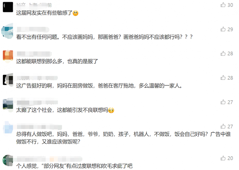 原广告画面 广告发布不久,有网友拍摄该广告画面发布在社交平台上,并指出内容容易让人产生“不良联想”,认为画面“将家务和育儿天然归类于母亲”。该观点得到部分网友支持,他们认为广告存在强化性别刻板印象的嫌疑,由此引发热议。短时间内,微博、小红书等社交平台上,涌现出“合口味地铁广告被指引发不良联想”“合口味地铁广告被指加深刻板印象”等多个热议话题。