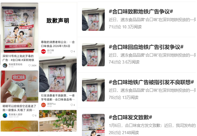 小红书及微博相关话题 争议升级: 日前,合口味品牌方就网络争议发布致歉声明,承认广告内容“细节欠缺考量,引发部分消费者的不良联想”,同时宣布启动广告更换程序。随即,大批网友反馈合口味地铁广告已经撤下。但令人意外的是,一场新的争论就此展开。围绕着广告“该不该撤”,部分消费者是否“无病呻吟”等新话题,几方观点在社交平台上展开激烈交锋。