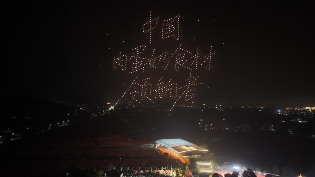 温氏股份总裁黎少松向林述巍颁发“温氏食材严选推荐官”聘书 科技点亮夜空,绘就融合新图景 当晚八点,无人机群腾空而起,以天为幕,演绎了一场震撼的光影盛宴。夜空中依次浮现“千人火锅 共创纪录”、“中华土鸡 餐桌C位”、“温氏食材 中国肉蛋奶食材领航者”、“邻家农场 我家厨房”、“温泉康养 寻味新兴”、“农文旅融合发展”等绚丽画面,巧妙串联起当日盛事、本地文化特色与产业发展愿景,并将温氏的品牌定位与理念进行动态呈现。这场科技与艺术交融的表演,与农场的自然生态相映成趣,构建出“产业+文旅+科技”的多元体验场景,将活动热度推向高潮。