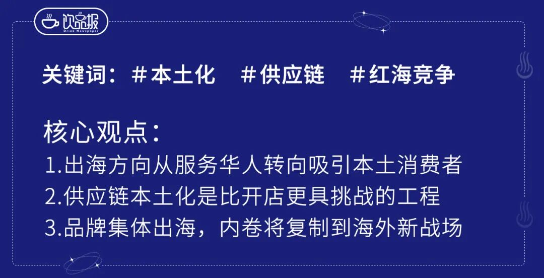 当众多品牌在海外市场高歌猛进时,另一面的故事也同样真实。热火朝天的开店竞赛背后,是每一个品牌都需要面对的本地挑战。玩家纷纷寻求“搭快车”,正是因为前方并非一帆风顺。 以霸王茶姬在泰国的动作为例。在其与泰国总统饮料集团达成正式合作之前,霸王茶姬就针对泰国市场做出了一个关键调整。2025年4月,霸王茶姬暂时关闭了当时在泰国的所有门店。一个多月后,品牌以全新的“Tea Bar”理念重新亮相。霸王茶姬这次迅速的“关闭与重启”,是中国饮品品牌探索海外市场的一个缩影。 “狂飙”之下,品牌出海面临着复杂的课题。 客群从哪里来?从“华人特供”到“本地爆款”的跨越。初期依赖华人社群是一条稳妥的起跑线,但天花板也很明显。真正的增长在于吸引庞大的本土消费者,这直接考验品牌对当地市场的理解深度。 本土化的产品是切入本土消费者的第一步。以蜜雪冰城为例,其在马来西亚推出了以当地特色香料肉骨茶为灵感的冰淇淋和茶饮;在越南整体调高了奶茶的糖度,同时推出了包括香茅、凤梨等在内的当地特色水果茶。显然,本土化并非一味追求新颖,而是在市场教育程度与产品独特性之间找到平衡点。 原料从哪里来?比开店更难的是“供应链出海”。在海外,每一样食材都可能面临不同的检疫标准、仓储物流和采购成本。建立稳定、合规且高效的本地供应链,是一项耗时、耗钱的“后台工程”,它直接决定了产品品质的稳定性和最终的盈利能力。也正因如此,茶百道、霸王茶姬寻求海外战略合作的关键目的之一,便是本土供应链的高效搭建。 竞争到哪里去?扎堆出海,“内卷”战场外移。当蜜雪冰城、瑞幸、库迪、喜茶等品牌集中涌入东南亚等热门市场时,国内激烈的“内卷”正在海外重现。价格战、选址争夺、营销比拼,可能导致市场在短时间内从“蓝海”变为“红海”。如何在新的战场上避免重复消耗,找到自己的差异化生存空间,是另一个现实的战略考题。