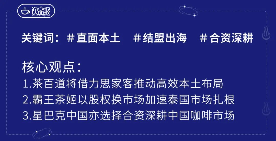 思家客 那么,茶百道与思家客结盟,就是接入一个流量充沛的本地商业生态系统,用合作换效率,为出海按下“快进键”。 “搭快车”加速出海的饮品品牌,不只有茶百道。 早于茶百道,霸王茶姬在发力泰国市场时,走了一条更彻底的路径。它与泰国本土的总统饮料集团成立合资公司,并让渡了51%的控股权。这种“以股权换市场”的方式,旨在直接换取对方数十年的主流渠道、本土化理念等,以实现更快速度的扎根。 霸王茶姬2025年第三季度财报显示,仅仅第三季度,霸王茶姬海外门店就新增54家门店,其中泰国14家。2025年10月,霸王茶姬全球“最高”门店在泰国王权大京都大厦(位于该大厦74层)的亮相,又引发热议。