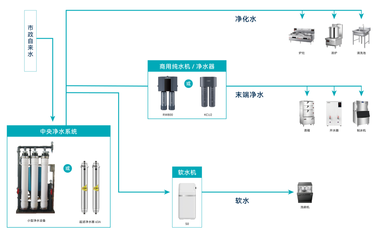 针对商用厨房面积紧张、用水场景多元、能耗敏感的特点,立升摒弃“一刀切”的高能耗纯水方案,创新性提出 “分质供水,精准净化” 的全厨净水策略。该体系根据后厨各环节对水质的核心需求进行科学分级处理: 中端保障(烹饪/清洗区):为炒炉、汤锅、洗碗机、洗菜池等区域供应 “净化水”或“软化水” 。重点解决水垢问题,保护昂贵的热力设备,提升清洁效率,同时满足大量清洗用水需求。