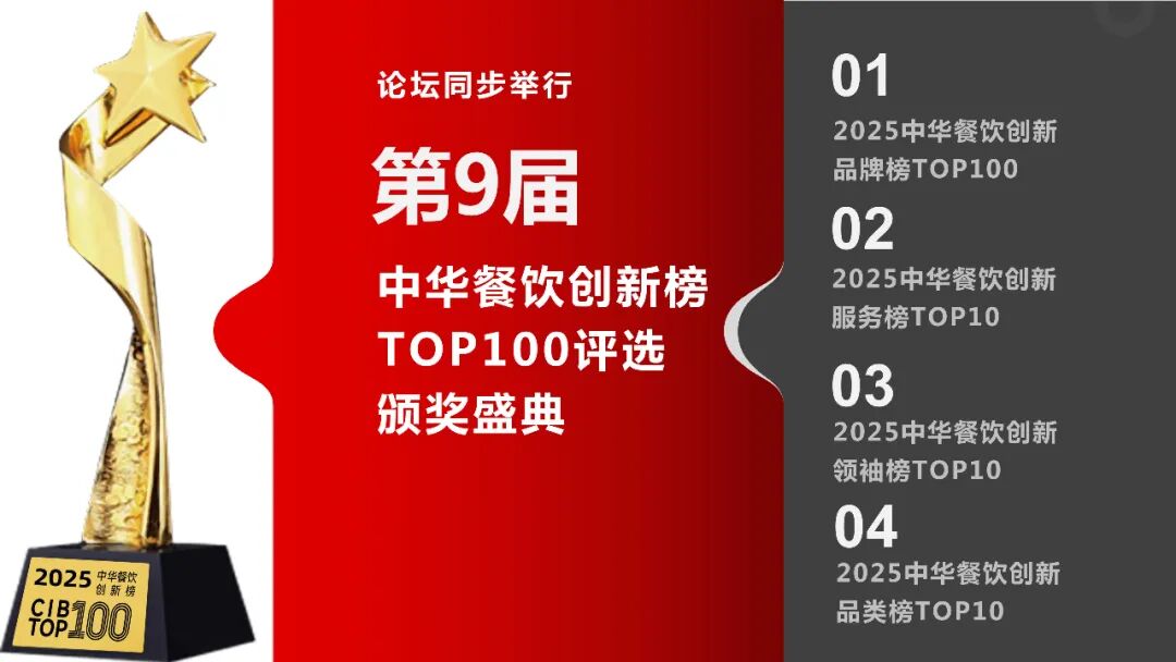 03、同期举办 01、2025第9届中华餐饮创新榜TOP100颁奖盛典 中华餐饮创新榜 (CIB TOP100)是由国内优质 餐饮行业媒体《餐饮界》联合全国150+媒体发起的餐企创新榜单公益评选活动。届时,第9届中华餐饮创新榜TOP100颁奖盛典将公布创新品牌榜、创新服务榜、创新领袖榜以及饮 品投 资价值榜共4大榜单。