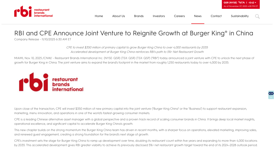 发表时间:2025-11-16 23:17来源:小食代 在星巴克宣布将中国业务60%股权出售给博裕投资后不久,汉堡王中国的新东家也“找着了”。 今天,拥有汉堡王、Tim Hortons和Popeyes等诸多餐饮品牌的RBI集团(Restaurant Brands International)、CPE源峰共同宣布,CPE源峰与RBI达成战略合作,双方将成立合资企业(汉堡王中国)。交易完成后,CPE源峰将持有汉堡王中国约83%的股权,RBI将保留约17%的股权。 该笔交易预计将于2026年第一季度完成,具体时间依监管审批程序进展而定。 这意味着,在经历了多年土耳其巨头TFI的特许经营,以及最近约8个月的RBI直接“代管”后,进入中国20个年头的汉堡王在华再次有了“操盘手”,RBI也兑现了此前说的“寻找过程将在一年内完成”的承诺。汉堡王中国目前约1300家店、年收入约50亿规模。 下面,我们看看协议详情。 ![]() 新东家 根据双方今天发布的通报,CPE源峰将向汉堡王中国注入3.5亿美元(折合人民币约25亿元)的初始资金,用于支持其餐厅门店扩张、市场营销、菜单创新以及运营能力提升,把握中国这一全球增长最快的消费市场机遇。 在本次交易中,汉堡王中国旗下全资关联企业将签署一份为期20年的主开发协议,该协议将授予其在中国独家开发汉堡王品牌的权利。交易完成后,CPE源峰将持有汉堡王中国约83%的股权,RBI将保留约17%的股权,并获得一个董事会席位。交易完成后,RBI将在其国际业务板块中开始确认来自汉堡王中国业务的特许权使用费,并将随着时间的推移逐步提高至该业务的历史全额费率。 根据整体规划,双方计划将汉堡王在中国市场的门店规模从目前的约1250家,拓展至2035年的4000家以上,并实现可持续的同店增长。 CPE源峰董事总经理毛卫今天在一份通报中表示,汉堡王是全球知名品牌,长期以来备受中国消费者青睐。 “此次投资彰显了我们对汉堡王在中国长期增长潜力的信心。依托我们在中国的深耕和对本土消费者的深刻洞察,我们致力于让更多中国消费者品尝到汉堡王独具特色的火烤汉堡。”他说。 RBI首席执行官Joshua Kobza今天表示,中国仍是汉堡王在全球范围内最具吸引力的长期增长市场之一。近期投资及此次成立的合资企业彰显了我们对中国市场的信心。他赞扬CPE源峰资本雄厚且经验丰富,不仅具备卓越的领导力,更在消费及餐饮领域积淀深厚,是助推汉堡王中国开启新篇章的理想合作伙伴。