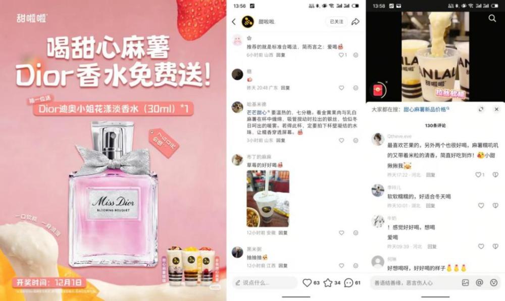 ▲图源:甜啦啦官微 为打造这场冬日回归盛宴,甜啦啦还展开了一场线上线下联动的组合营销。线上,小程序抢券、抖音直播秒杀、外卖平台专享折扣轮番上阵;线下,门店变身“温暖驿站”,不仅“买即赠甜心杯套”,还能抽Dior香水、甜心公仔,直接把冬日氛围感拉满。