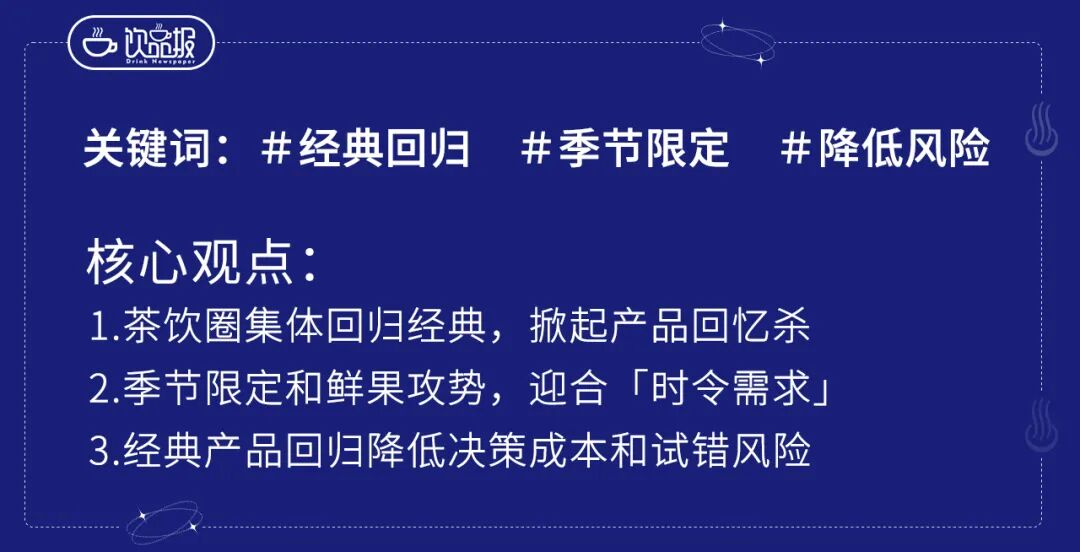 这些应季水果产品的回归,不仅满足了消费者对“鲜”的追求,更巧妙地利用了食材的季节性特点,为产品注入了独特的“限时”魅力,有效激发了消费者的购买意愿。 为何品牌们纷纷加入这场“经典回归”大军? 从经营角度看,经典产品回归降低了消费者的决策成本,其无需教育市场,消费认知度高,可以用熟悉的味道撬动复购。与此同时,该动作还缩短了研发周期,成熟的配方、稳定的供应链保证出品效率与品质稳定,有效控制新品试错风险。