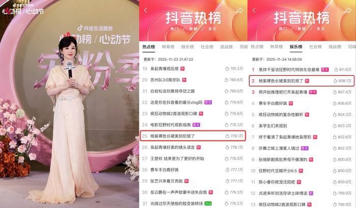 心动宠粉季的核心环节“惊喜见面会”,让线上的所有心动,在线下都听到了热烈的回响。获得门票的用户与杨紫通过多轮游戏展开互动,从趣味猜谜、真诚对话到全场合影,细节满满的宠粉环节引得现场尖叫不断。这份双向奔赴的美好也延续至线上,#杨紫裸色长裙美到犯规了 话题强势登上抖音总榜Top25、娱乐榜Top2,相关内容播放量持续发酵,引发热议与转发。
