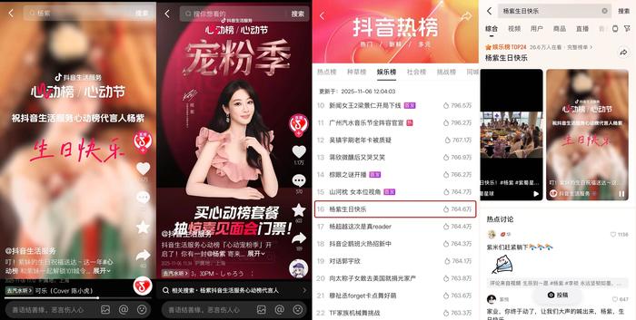 全网都在晒:被杨紫“宠粉”的快乐 11月6日,抖音生活服务官方账号发布杨紫庆生视频及活动官宣内容。其中#杨紫生日快乐 登上抖音娱乐榜Top16,#杨紫的庆生仪式感 跻身抖音总榜Top24、娱乐榜Top3,微博、新浪等平台相关话题同步上榜,实现庆生与宠粉热度的双重扩散。