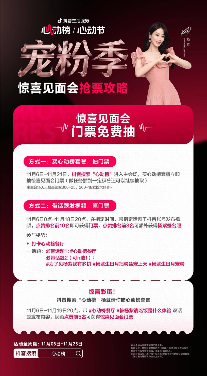发表时间:2025-11-25 10:40 这个11月,抖音生活服务心动榜携手代言人杨紫,带来了一场好吃又好玩的「心动宠粉季」!活动近日圆满落下帷幕,屏幕前的你有没有赶上这次的宠粉福利呢? 此次心动榜的活动以杨紫生日为契机,将宠粉和心动榜餐厅联系起来,围绕“杨紫请吃饭”设计福利机制,用“惊喜见面会门票”提升粉丝的参与动力,并在线下商圈设置主题打卡点,让用户感受到满满的心动和惊喜!