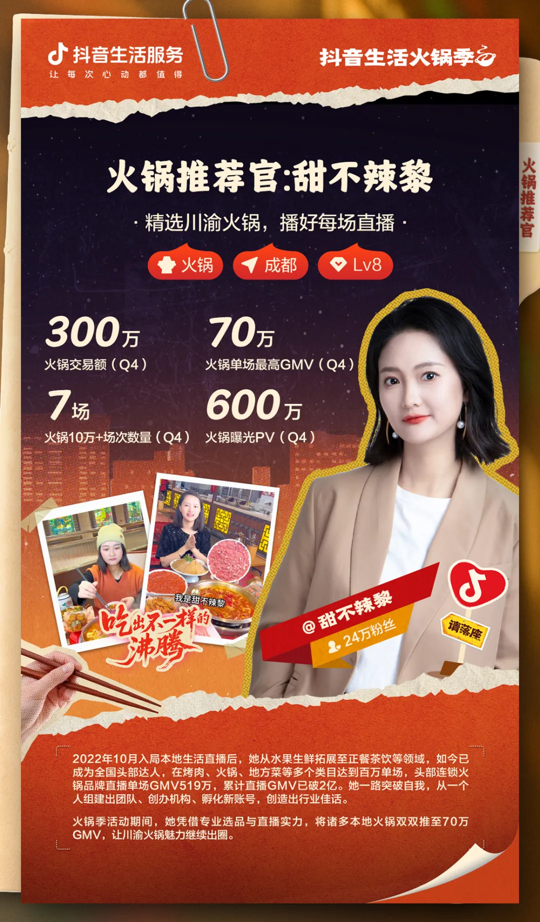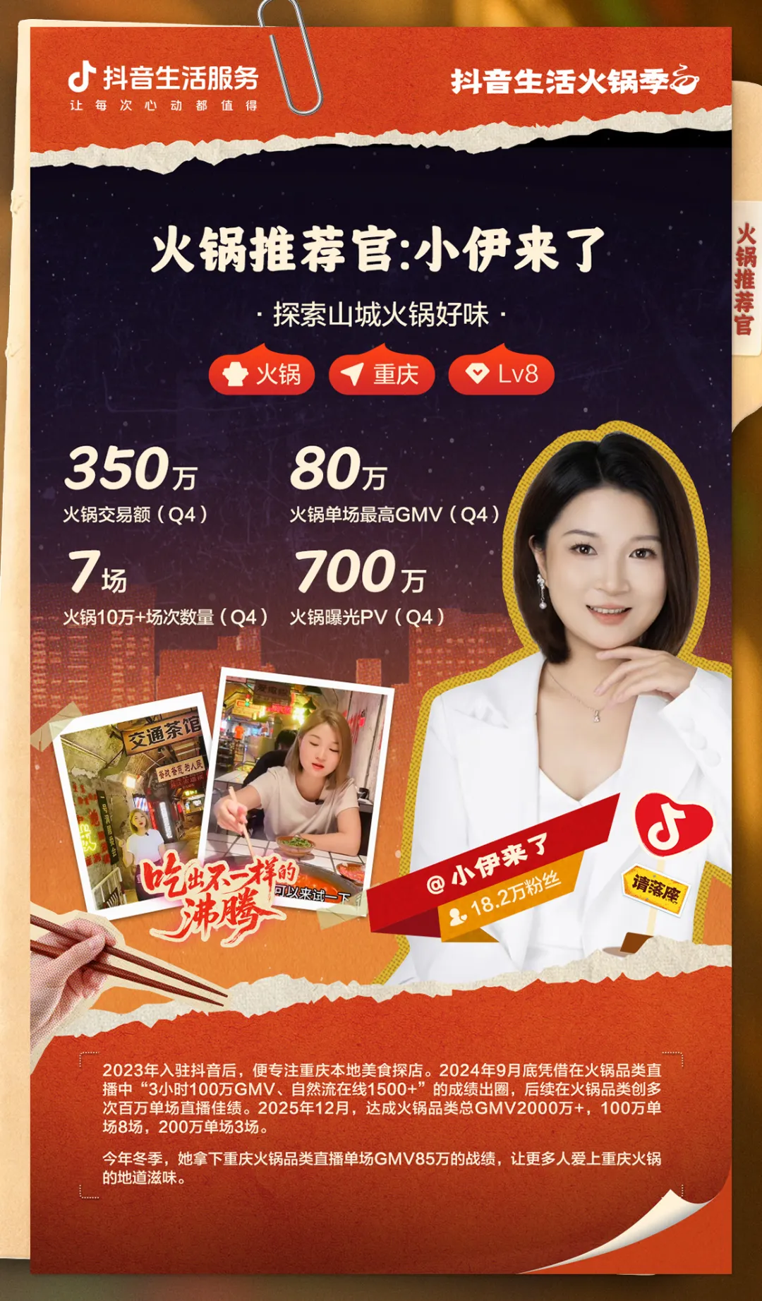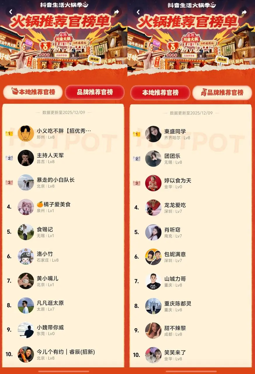 发表时间:2025-12-16 15:33 新一轮降温仍在路上,寒风一吹,谁都不会拒绝一锅咕嘟冒泡的火锅!而市面上宝藏火锅店藏龙卧虎,毛肚脆爽、肥牛鲜嫩、菌汤醇厚、牛油滚烫……各样特色锅底、新鲜食材还需达人为食客们“牵线搭桥”! 11月7日至12月21日,抖音生活服务「抖音生活火锅季」以“吃出不一样的沸腾”为主题,凸显地域火锅特色,以独特性串联用户与商家,联动全国火锅商家与达人打造冬日美食盛宴。活动期间,平台全面覆盖头腰尾部达人,准备了头部达人直播大场激励、头部达人视频探店激励、短视频直播训练营、火锅推荐官榜单四大达人玩法。除线上福利外,更有线下惊喜即将登场——12月19日至21日,一场融合红毯秀、脱口秀、趣味颁奖与火锅市集的抖音生活服务「沸腾嘉年华」将在重庆朝天门码头热力启幕,冬至当天(21日)更将迎来活动收官! 作为本次「抖音生活火锅季」的重要达人玩法,火锅推荐官榜单竞争热度仍在攀升。无论是深耕本地的区域达人,还是辐射全国的品牌推手,都在通过优质内容争夺榜单席位,向丰厚奖励发起冲击:「本地推荐官榜」聚焦区域特色,郑州“小义吃不胖”、太原“凡凡逛太原”等达人深耕本地探店,用接地气的体验分享挖掘城市火锅宝藏;「品牌推荐官榜」则覆盖全国连锁品牌,成都“甜不辣黎”、重庆“重庆陈都灵”等达人凭借专业带货能力,助力品牌打破地域壁垒。 活动开展至今,上榜达人们皆用专业实力书写着火锅带货佳绩。本期有三位达人的优质案例新鲜出炉: 成都达人“甜不辣黎”从水果生鲜赛道起步,随后涉足正餐、茶饮等多个领域,一路成长为全国头部本地生活达人,如今不仅组建了专属团队、创办机构孵化新账号,更在火锅赛道创下耀眼战绩:头部连锁火锅品牌专场直播单场GMV曾高达519万,多家重庆本地火锅品牌直播均斩获百万成绩。凭借成熟的直播运营经验与精准的选品眼光,她为连锁火锅品牌破圈与细分火锅品类推广提供了高效范本,直播累计GMV已超2亿,用专业交付力赢得商家与粉丝双重认可。
